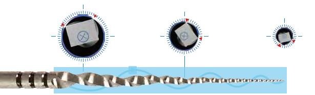 BLUE: Heat treated rotary file system with blue standard, increased resistance to cyclic fatigue and additional flexibility, in addition, it has the option of precurving the instrument, to obtain an easier access to the canals, when needed.